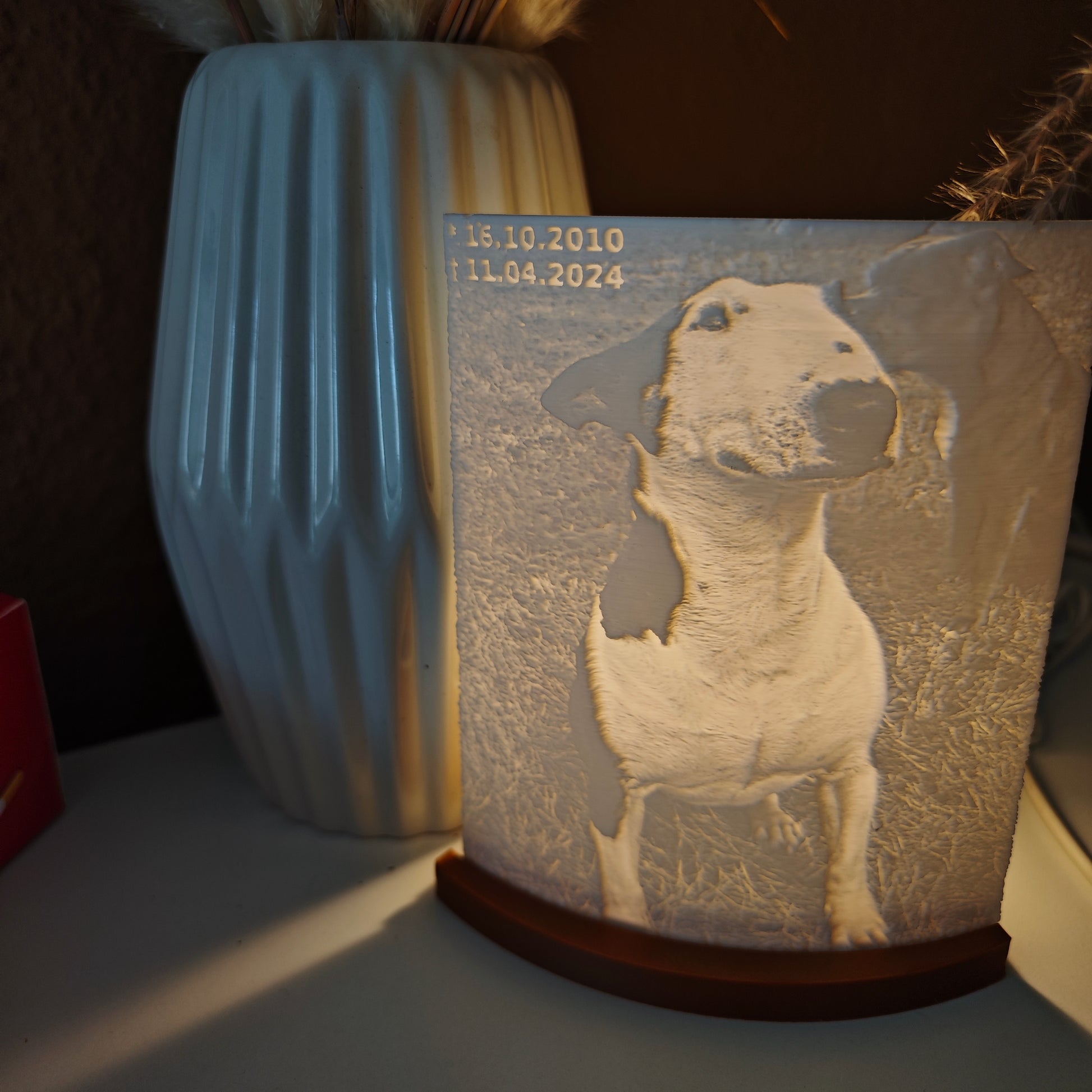 Mit der richtigen Beleuchtung erwacht das Motiv zum Leben und zeigt beeindruckende Details in Licht und Schatten. Ob als persönliches Geschenk oder stilvolle Dekoration – ein Lithophane ist immer ein Hingucker!